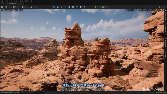 画面中的每一颗石子的棱角都清晰可辨在整个“古代山谷”示例项目中,我们可以看到层次和棱角分明的山川荒野,即使镜头拉近,每一颗石子的棱角都能清晰可辨,这样的创作在过去的动画电影中是不可想象的,这样逼真的场景创作以前肯定是费时费力,所以如果是动画电影,山川树林的中景远景必然要简化点。
